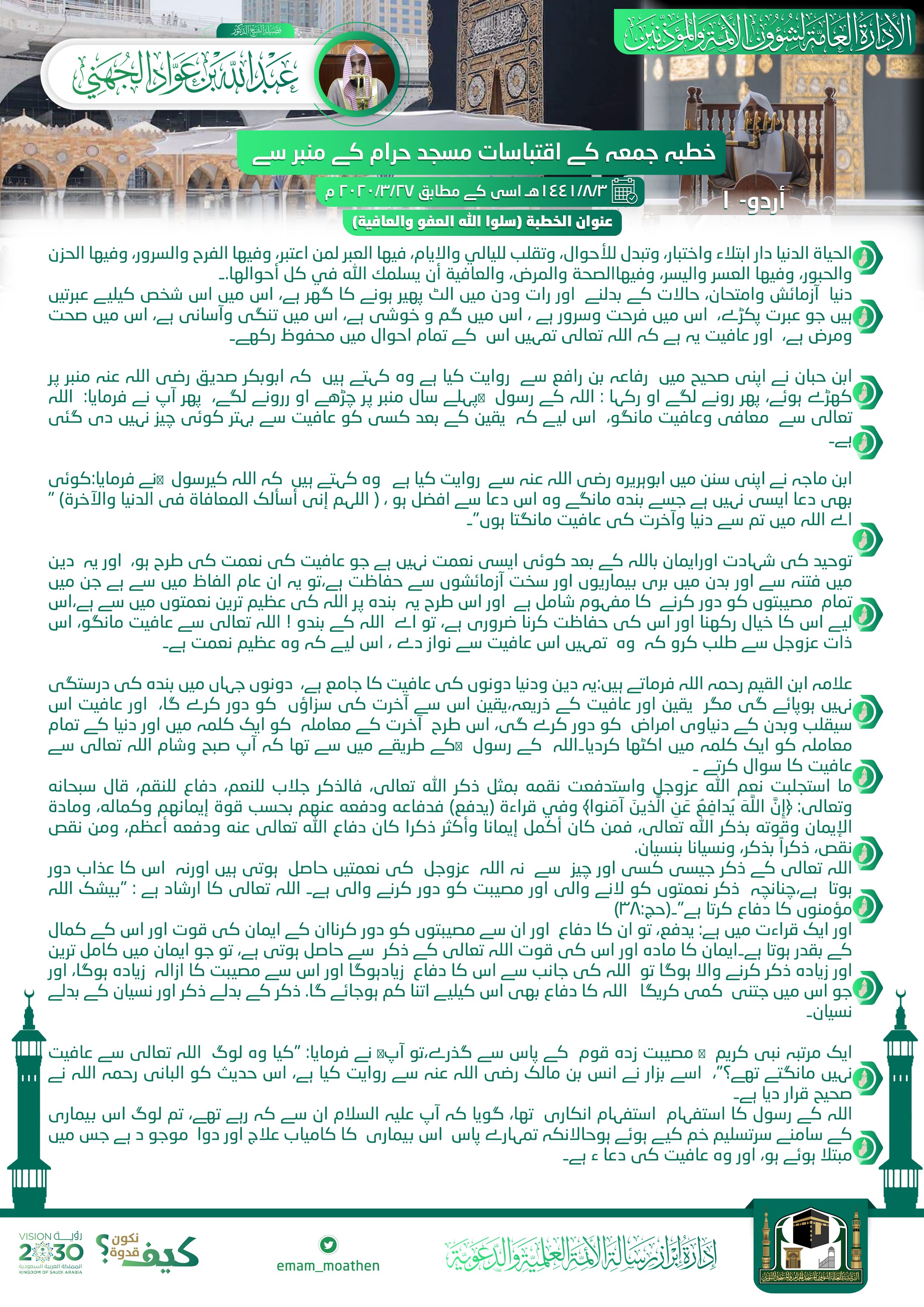 بتاریخ: 03 شعبان 1441 ۔۔۔ بمطابق 27 مارچ 2020